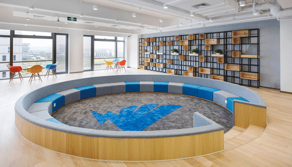 在工区设计上,以钉钉蓝为主色调,没有压抑的层高,更没有各种隔断的空间。同时,无论是“泳池”讨论区,茶室,还是随处可见的吧台,吊椅,地毯,懒人躺,只要你想,哪里都可以成为你专属的办公小天地。